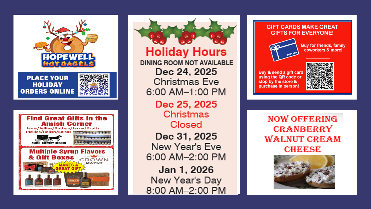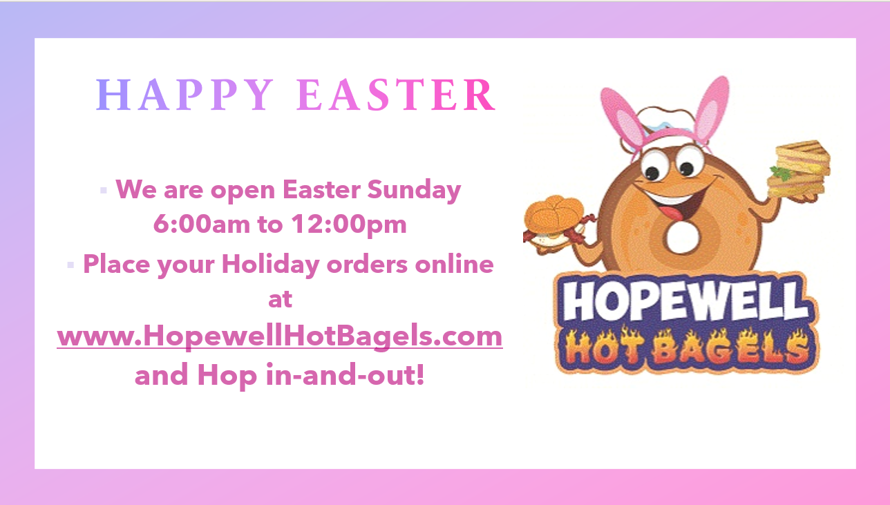 Spreading delight since 1986! Hopewell Hot Bagels has something for everyone! Come in or order online and enjoy our amazing selection of bagels made fresh everyday from just a few simple ingredients. We also carried a wide assortment of pastries and cookies.
